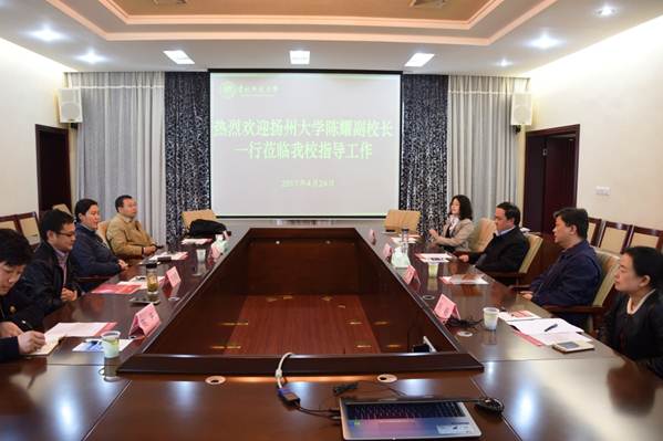 扬州大学党委常委,副校长,教授,博士生导师陈耀,扬州大学商学院,教授,博士生导师钱忠好,扬州大学财务处处长华清君,扬州大学财务处科科长陈东,一行四人到我校交流学习。并参观我校校史馆。